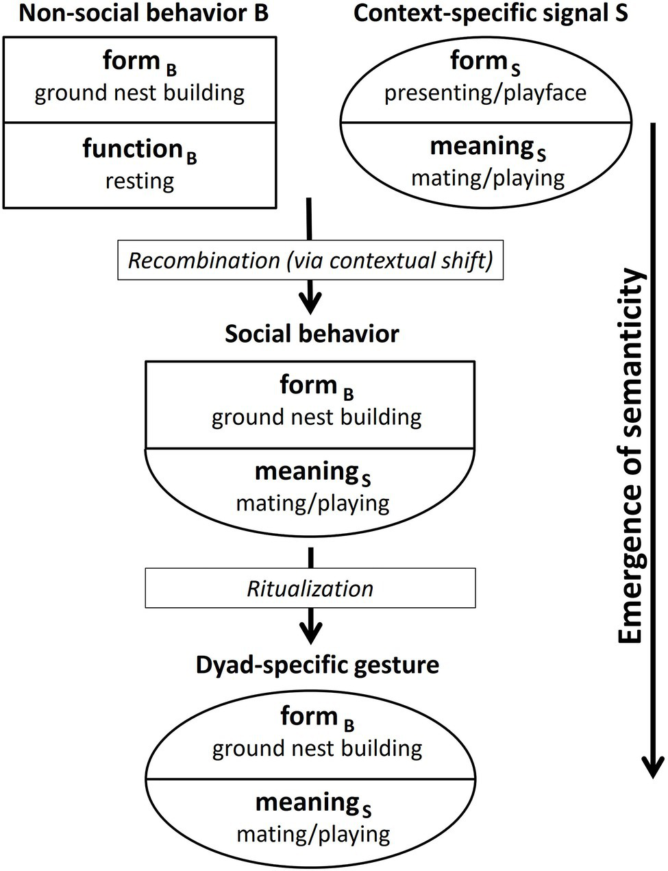 The emergence of semanticity, as shown in Figure 1, comprises, in a first step, the recombination of the form of a non-social behavior B (formB: e.g., nest-building) with the meaning of a context-specific signal S (meaningS: e.g., sexual solicitation/play invitation) on the sender’s side. These context-specific signals carry a message about a communicative interaction. For chimpanzees, for instance, in the play context this might be a play face and/or play gait (van Hooff, 2012; see Wilson, 1975 for other species). In the mating context, the presenting of an erect penis defines the communicative context and thus determines the meaning of any other signals used in combination by the male, for instance, BRANCH SHAKING and STOMPING.6