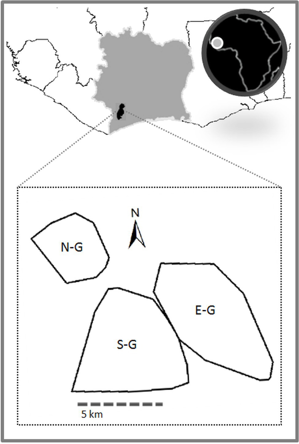 Figure 4. The three habituated chimpanzee communities in Taï National Park, Côte d’Ivoire (N-G = North group; S-G = South group; and E-G = East group). Polygons indicate the home ranges of the chimpanzee groups at time of observation (2007–2009).