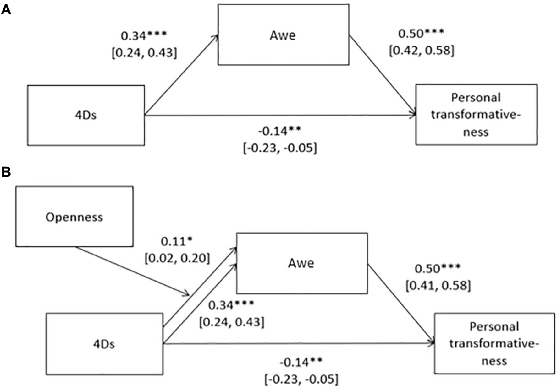 | 1a | Engaging in behaviors to alter states of consciousness at raves (i.e., the 4Ds) will be associated with awe, which in turn will be associated with personally transformative experiences. |