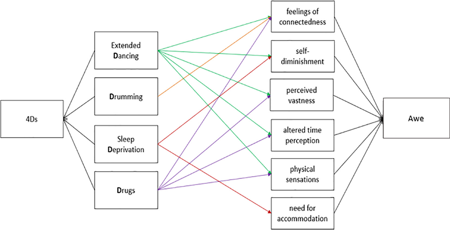| 1c | Of the 4Ds - extended dancing, drums, sleep deprivation, and drugs - drug use will be most associated with awe, and more specifically, psychedelic drugs. |