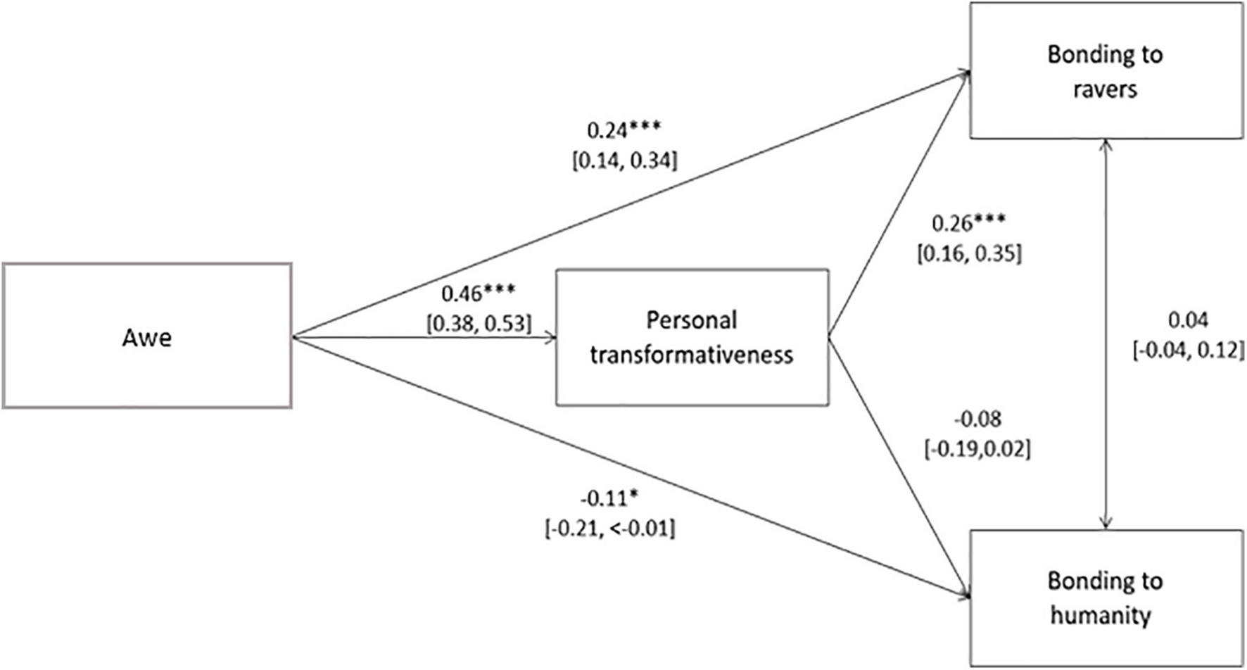 | 2a | Awe experienced during the rave will be associated with greater bonding to other ravers and humanity, when the rave was a personally transformative event. |