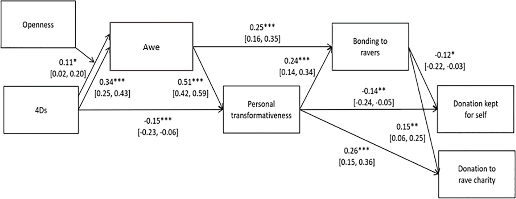 First, we investigated whether participants engaged in the 4Ds (dance, drums, sleep deprivation, and drugs) at particularly memorable raves or free parties and whether this in turn was associated with feelings of awe and personal transformation (H1a). We focused on the roles trait openness (H1b) and ego-dissolving drugs (CSPs, psychedelics) played in the process (H1c). We also tested which types of awe experiences had the strongest association with personal transformativeness (H1d).