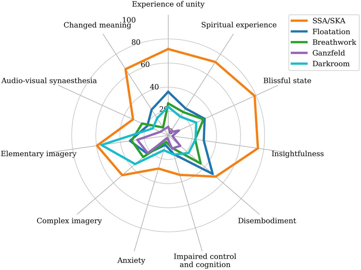 Figure 3. Radar chart comparing the mean subscale scores of the 11-Dimensional Altered States of Consciousness Rating Scale (11D-ASC; Studerus et al., 2010) for the participants of this study (SSA/SKA; N = 152) and for non-drug induced altered states of consciousness (ASCs) produced by the floatation tank (Floatation; 60 min; N = 27; Luke et al., 2019); Holotropic Breathwork (Breathwork; 60 min; N = 23; Luke et al., 2019); anechoic darkroom (Darkroom; 120 min; N = 46; Luke et al., 2018); and ganzfeld environment (Ganzfeld; 25 min; N = 22; Schmidt and Prein, 2019).