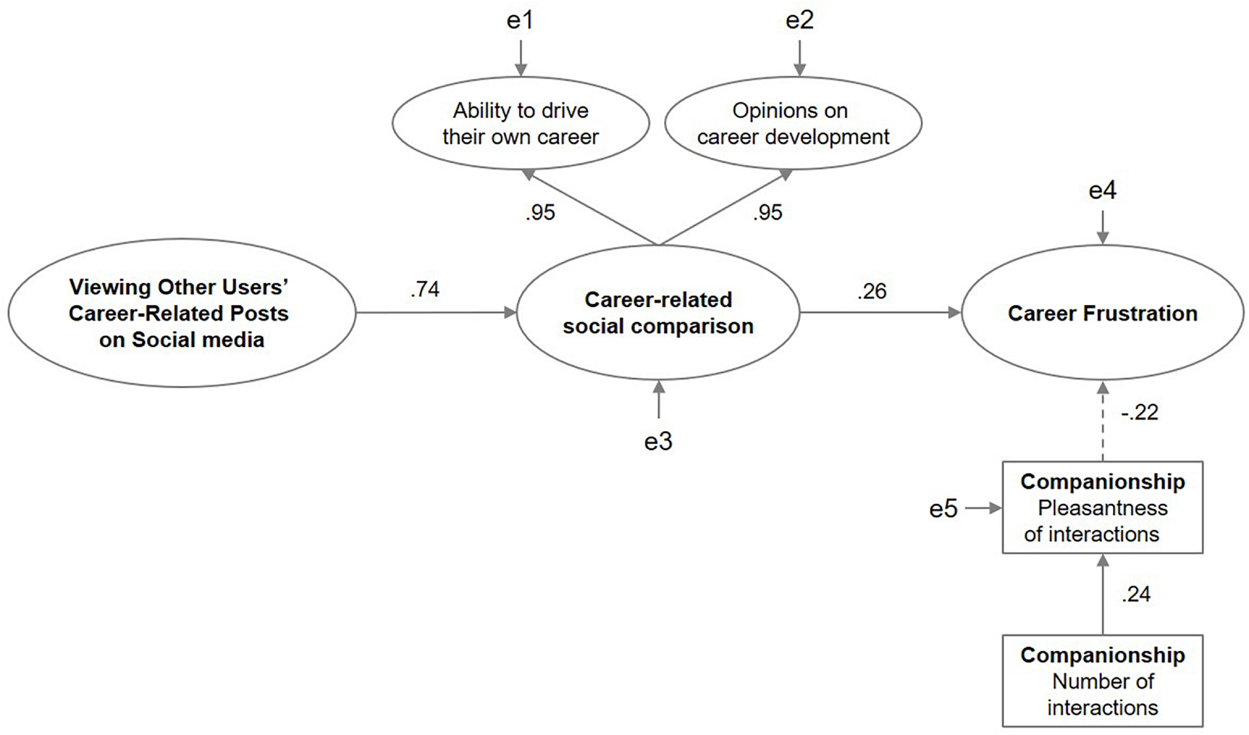 Figure 1. Structural relationships between the studied variables: viewing other users’ careers on social media, career-related social comparison, career frustration, and companionship. The observed variables are indicated by rectangles and the latent variables are indicated by ellipses. Positive coefficients are shown using solid arrows, while negative coefficients are shown using dotted arrows. All paths are significant at p < 0.001. All coefficients are standardized.
