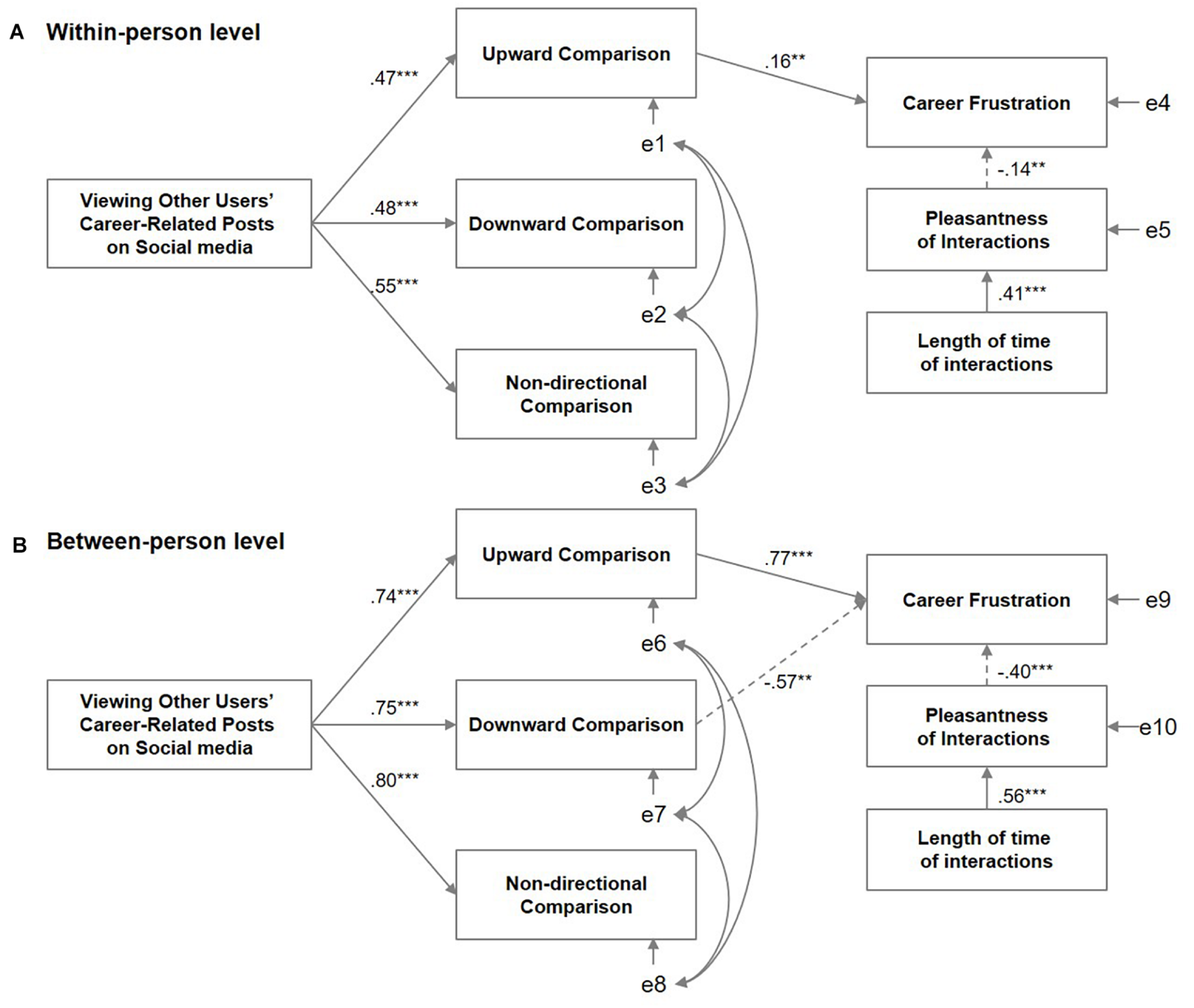 Figure 2. The two-level structural equation model for viewing other users’ careers on social media, career-related social comparison, career frustration, and companionship. (A) Within-person level. (B) Between-person level. Non-significant paths were removed for the sake of clarity. Statistical significance is indicated by ***p < 0.001, **p < 0.01. Standardized coefficients are shown. Positive coefficients are shown using solid arrows, while negative coefficients are shown using dotted arrows. The factor correlations among the social comparison factors are: upward − downward = 0.60 (within-person)/0.62 (between-person), upward − non-directional = 0.75 (within-person)/0.80 (between-person), downward − non-directional = 0.73 (within-person)/0.84 (between-person).