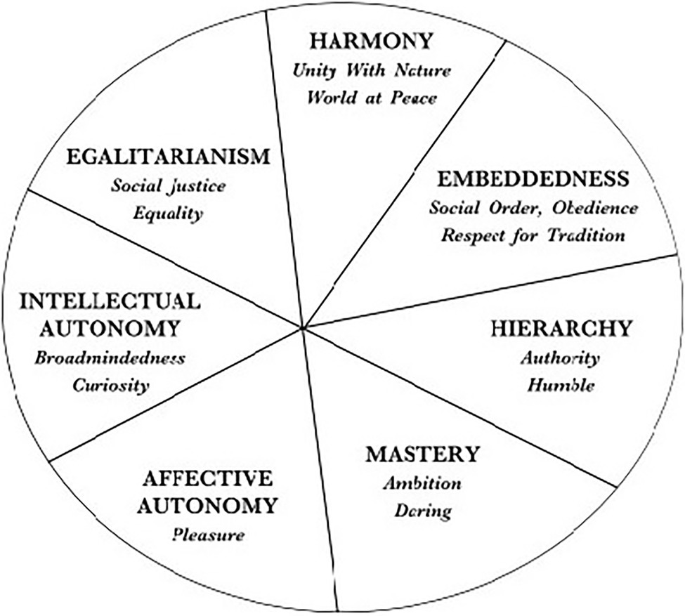 At the culture level, seven cultural value orientations can be captured along three distinct dimensions (Schwartz, 1994, 1999, 2006). Schwartz argues that there are three basic issues in every society: (1) to what extent an individual belongs to a group, (2) how to preserve the social fabric, and (3) how to relate to the social world. As seen in Figure 2, bipolar value orientations are formed, and cultural influences on which pole of the orientation are emphasized in society. Regarding the first societal issue, autonomy vs. embeddedness, autonomy partitions into affective autonomy and intellectual autonomy, which refers to values that encourage people to pursue positive experiences for themselves as well as their own ideas and intellectual aspirations. In autonomous cultures, individuals are encouraged to think, feel, and act as unique persons. The opposite pole, embeddedness, encourages traditional order, shared goals, ways of living, and the maintenance of the status quo is seen as a priority. The second societal issue produces the value types of hierarchy vs. egalitarianism. The hierarchy represents the hierarchical social order and unequal resource allocation; in contrast, egalitarianism emphasizes equality, mutual concern, and cooperation for everyone’s welfare. The last societal problem produces the values of harmony vs. mastery. The former reflect societal discourses in which the social and natural world is acknowledged as it is, and fitting in harmoniously is emphasized. Individuals strive for a world at peace and the protection of the environment. The latter depicts the active control of the social and natural environment through self-assertion values. Individuals are ambitious, seek success, and competence in order to attain group or personal goals.