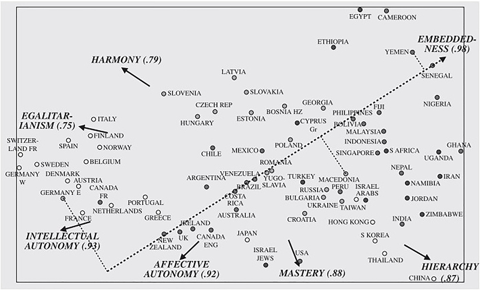 Cultural Value Orientations from 76 National Groups. The figure represents cultural value orientations from 76 national groups based on the combined teacher and college student samples. From Schwartz (2006). The figure has been used with the permission of the author.