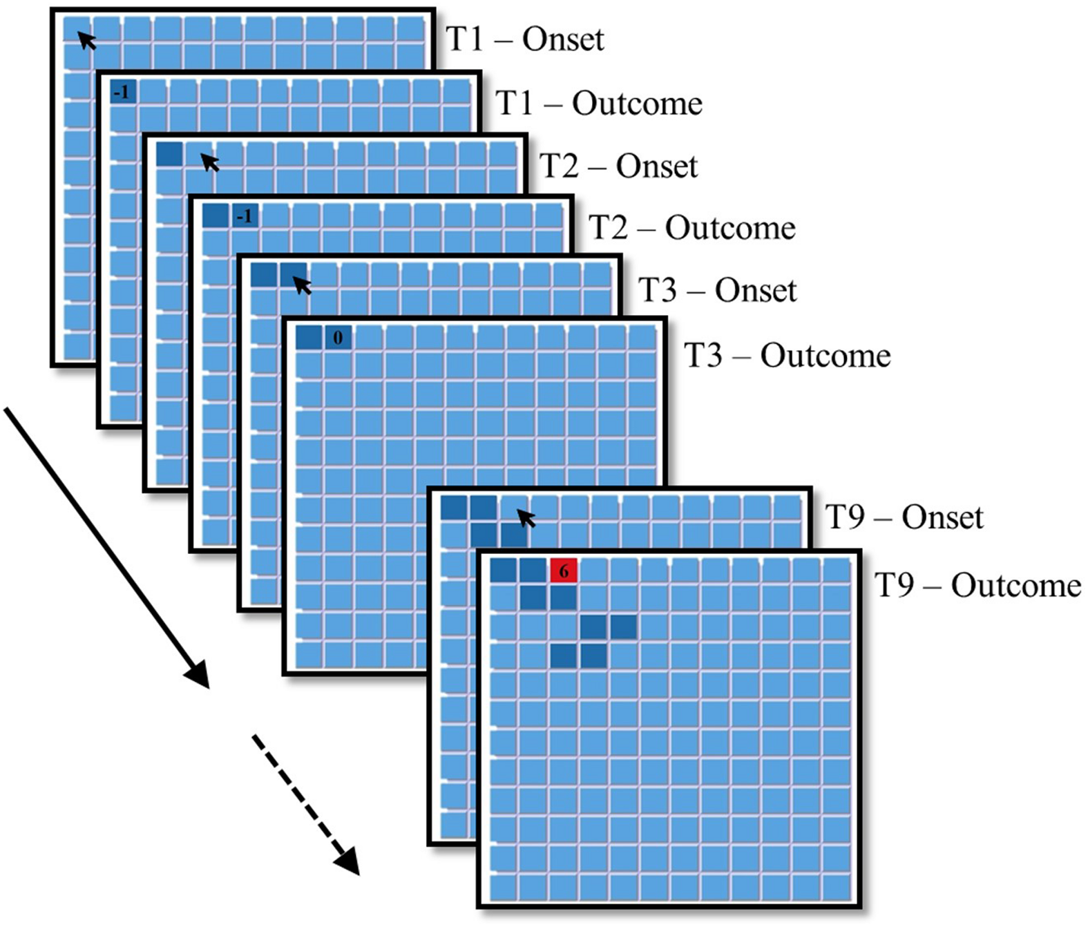 Examples of experimental screens for a hypothetical participant playing the first T = 9 trials in Study 1. Feedback regarding the trial’s outcome appeared for 1 s, after which the trial’s payoff disappeared and participants could choose again the same/another key.