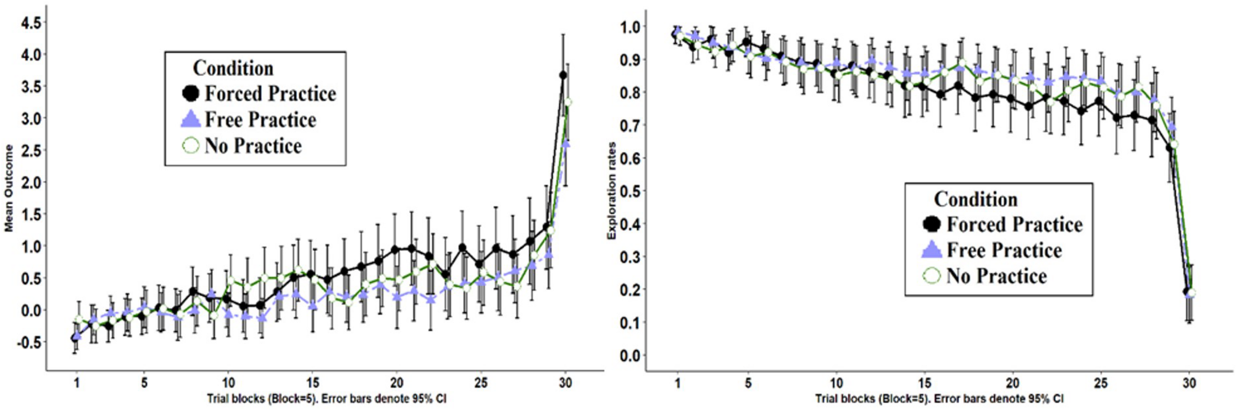 Table 2’s middle rows present the main results of Game 2, which was equivalent across all three Conditions. The left panel of Figure 2 presents the mean outcome across the 150 trials in Game 2, aggregated to blocks of five trials, for the three Conditions. To test for statistical significance we used a linear mixed-effects model (using R packages lme4, Bates et al., 2015; and lmerTest, Kuznetsova et al., 2017). We set random intercepts for participants, and fixed effects for Condition (three levels: No Practice, Forced Practice, and Free Practice) and Trial number (1–150, treated as a continuous variable) along with their interaction. The main effect for Condition (χ2(2) = 1.81, p = 0.404) was not statistically significant. We find a significant main effect for Trial (χ2(1) = 1042.0, p < 0.001), suggesting mean outcome increased significantly over trials in all the conditions. The interaction between Condition and Trial was also statistically significant (χ2(2) = 41.11, p < 0.001). A post hoc analysis shows the outcome increased as a function of trial in all three Conditions. This increase was more pronounced in Condition Forced Practice, b = 0.014, 95% CI [0.012,0.015], t(26911) = 22.5, and p < 0.001, compared with the No Practice Condition, b = 0.010, 95% CI [0.009,0.011], t(26911) = 17.7, and p < 0.001, and Free Practice Condition, b = 0.009, 95% CI [0.007,0.098], t(26911) = 15.1, and p < 0.001.
