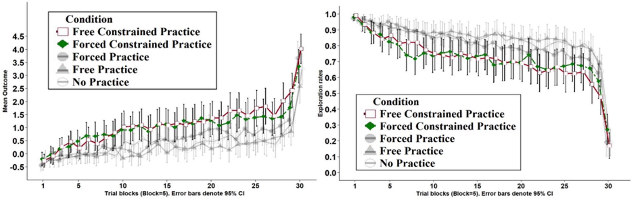 The results of Study 2 suggest that forcing repeated exploitation of options during practice can reduce the tendency to under-explore different strategies in our ill-structured task. Furthermore, our results suggest that a manipulation focused on constraining choices in a subset of practice trials can significantly improve performance in a subsequent task. This was especially evident when comparing performance in the Free Practice Conditions: while allowing participants to decide when to stop practice led to the worst outcomes in Study 1, combining this option with constrained exploration led to the best overall performance. Overall, the mean outcome per trial was almost twice as large in the Constrained Practice conditions (compared to the non-constrained conditions).