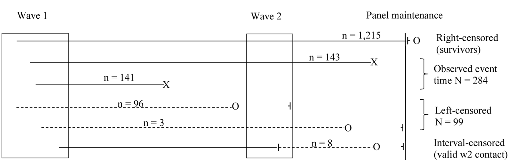 Based on consent, a total of 1,612 wave 1 participants were re-contacted in 2019/2020. Personal contacting during fieldwork revealed that 237 individuals had died since the first interview. Additional information on survival status and date of death was collected 1.5 years after wave 2 during regular panel maintenance work. By March 5, 2021 a total of 391 (24.2%) of respondents had died. The study was approved by the ethical board of the medical faculty at the University of Cologne (Protocol #: 17-169).