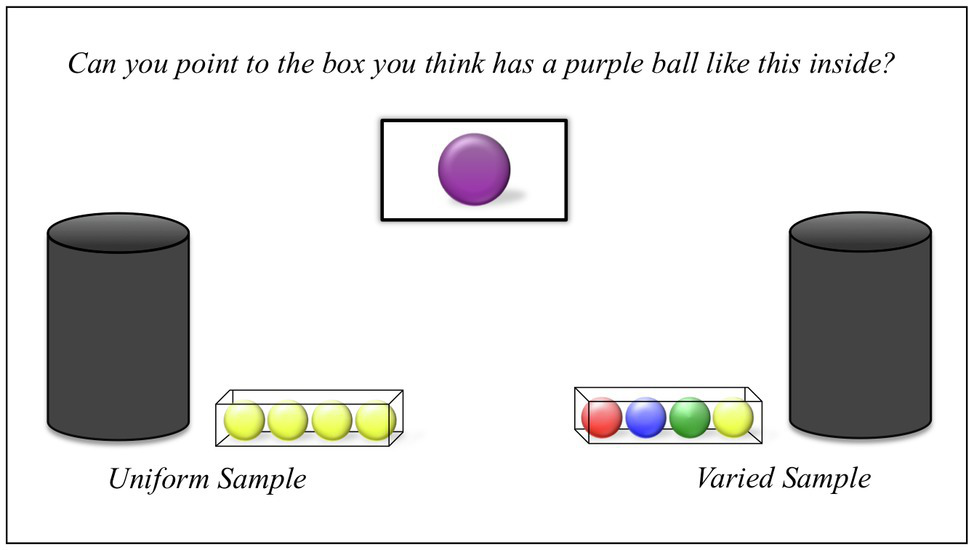 After drawing the second sample, the experimenter returned to the center of the table and addressed the child. Pointing at both the containers simultaneously, she said, “One of these two boxes has a purple ball, like this (holding a photograph of a purple ball), inside. Can you point to the box you think has the purple ball inside?” While asking this question, the experimenter looked straight ahead at the child to avoid biasing their response. If a child did not spontaneously indicate one of the two containers, the experimenter prompted by holding up the picture and repeating the question. Children who did not respond after two such prompts were excluded. After children indicated their choice, the experimenter reached into the selected container and drew a purple ball. Children were thanked for their participation and received a small gift.