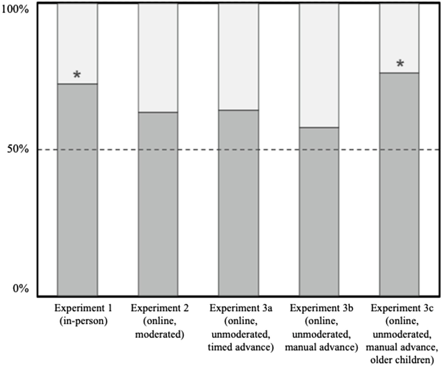 The proportion of children’s choices across in-person (Experiment 1), online-moderated (Experiment 2) and online-unmoderated (Experiments 3a-3c) testing platforms. Asterisks denote significance at p<0.05.