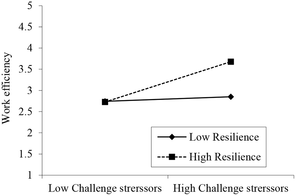 As mentioned above, challenge and hindrance stressors have different impacts on work efficiency. Accordingly, we further assume that resilience may moderate the link between challenge stressors, hindrance stressors, and work efficiency. The concept of resilience reflects the ability or dynamic process of positive adjustment in the face of danger that may be achieved through specific environmental conditions (Crane and Searle, 2016; Foster et al., 2020). The transactional theory of stress proposes that efficiently dealing with stressful situations may assist individuals in enhancing their resources and work efficiency (Kanwal et al., 2019d; Wang et al., 2021). Indeed, with resilience, challenge stresses may be overcome by individual effort and have positive results that may strengthen individuals' trust and capacity to adapt to future problems (Friborg et al., 2006; Hao et al., 2015). Scholars reported that resilience is the ability to recover or bounce back from stress and use it as a tool for managing a challenging job (Avey et al., 2009; Crane and Searle, 2016). Studies have also found that higher resilience has a significant effect on job satisfaction, task engagement, and work performance (Hartmann et al., 2020; Jannesari and Sullivan, 2021). Hao et al. (2015) observed that highly resilience personalities are more confident and capable of responding to challenge stress, and they are more efficient at utilizing surrounding supportive resources. Hence, resilience benefits challenge-stressed employees in coping with challenges more efficiently.