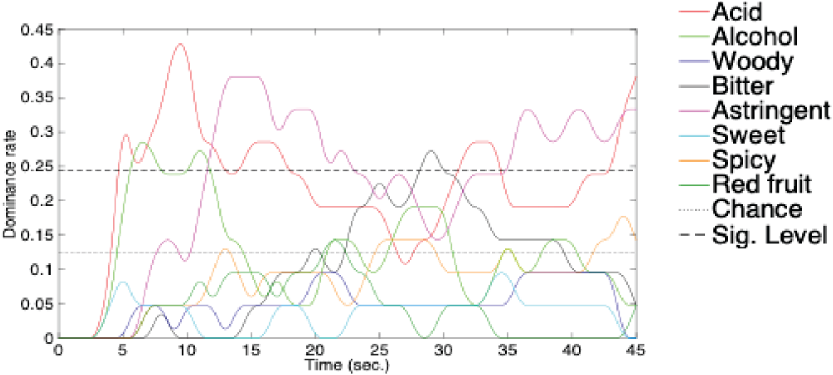A mouthful of Manos Negras Pinot Noir 2014 held in the mouth for a period of 45 s. Note that the horizontal dashed lines indicate chance level responding (given the eight possible descriptions) and a significant response across the group of participants whenever the time series exceed a dominance ration of 0.25. [From Wang et al. (2019b)].