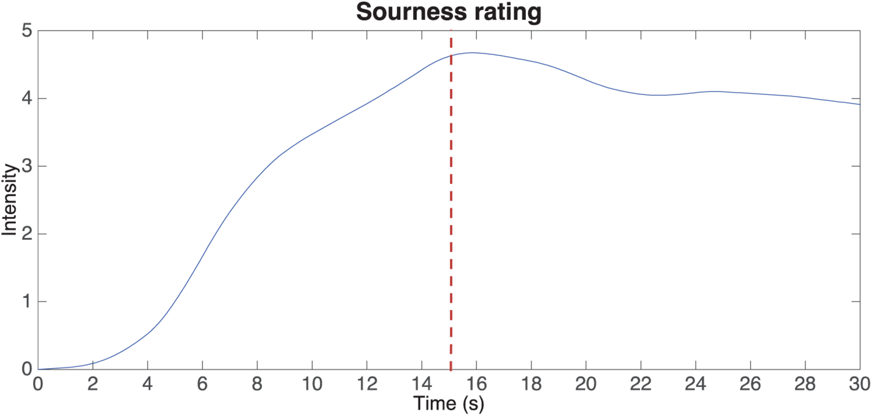 Mean values of time intensity (TI) values of sourness rating over time. The dotted line is shown at the 15-s mark, where the soundtrack changed from “sour” to “sweet.” [From Wang Q. J. et al. (2017)].