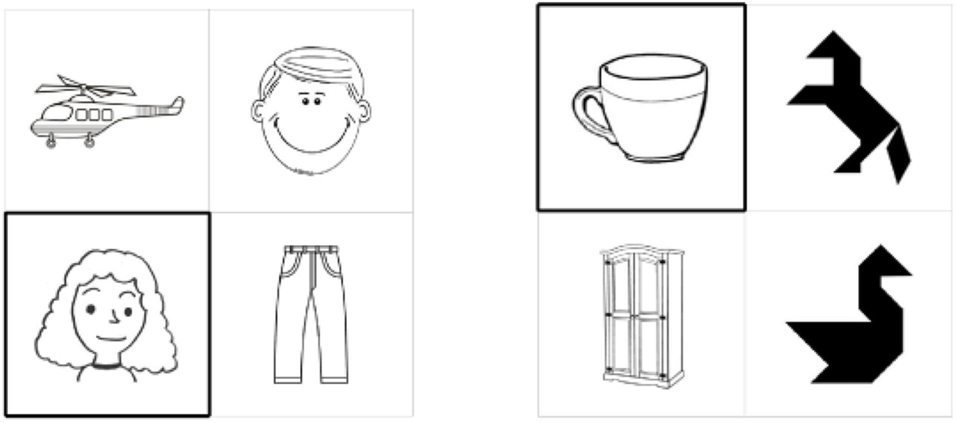 Filler items were images of human faces, tangrams, and artifacts (crockery, furniture, transport, and clothes), cf. Figure 2. In parallel to critical items, each filler slide contains four images of two types: e.g., two artifacts and two tangrams, two human faces and two artifacts, two tangrams, and two human faces. There are 72 filler items that are identical in all the three conditions.