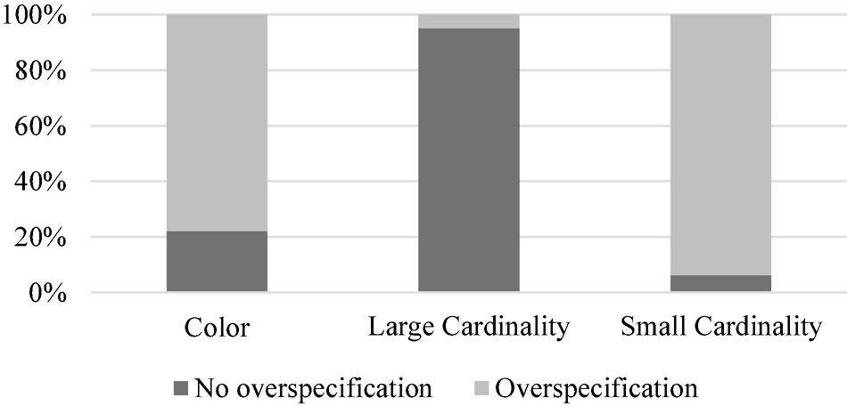 Distribution of (over-)specification in the color, small cardinality, and large cardinality conditions in the first experiment.