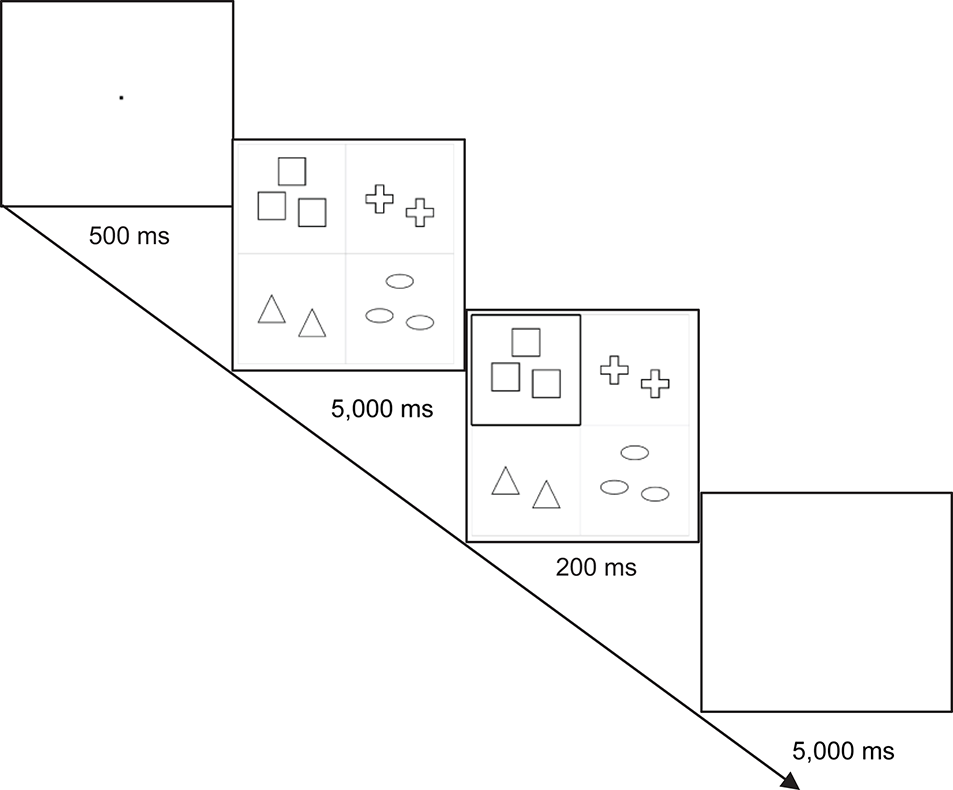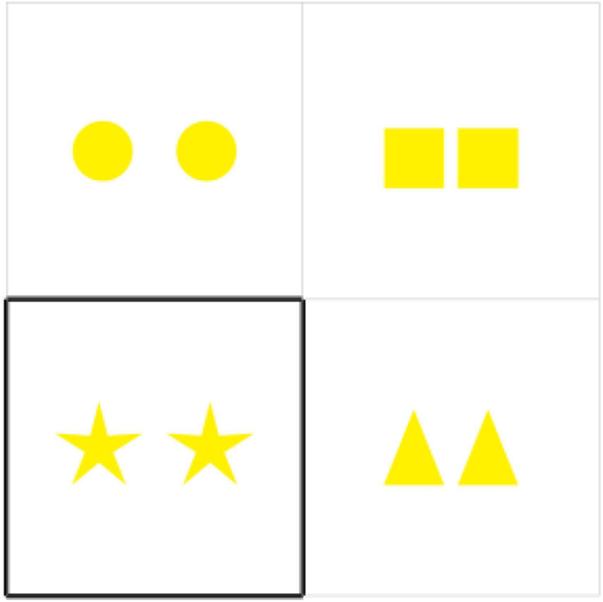 The design and procedure of the second experiment are similar to the design and procedure of the first experiment. We use 2 × 2 cells presented in one slide, each of which contains various geometric objects (squares, circles, triangles, and stars). The geometric objects are identical within each cell but are different among all cells. One cell of a slide is a target and is highlighted, whereas the other three are distractors. A target cell took different positions throughout the experiment: it could be any of the 2 × 2 cells. All the four cells comprise 4 different types of objects of one color and one cardinality. There are four colors (red, green, yellow, and blue) and three cardinalities (two, three, and four). This yields 48 critical items, that is, 4 geometric objects × 4 colors × 3 cardinalities. An example of a critical item is given in Figure 4.