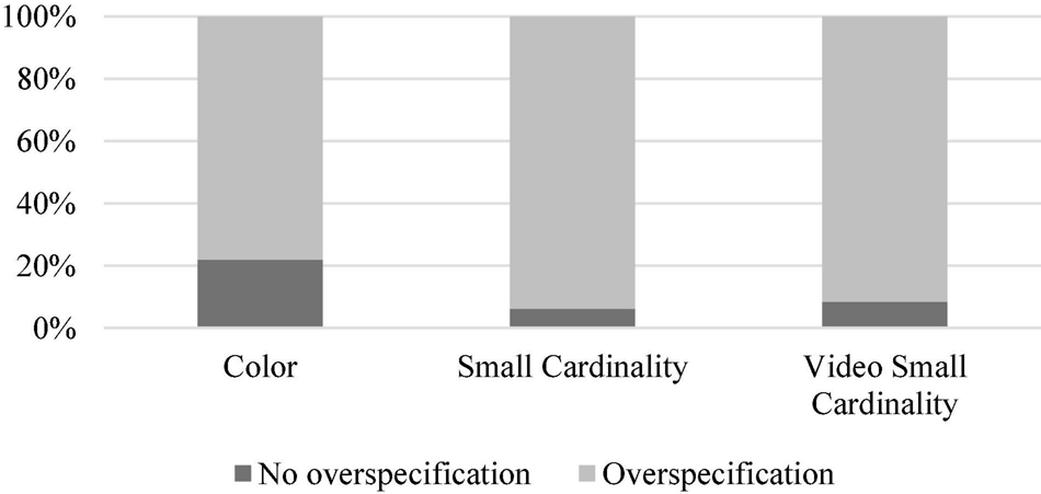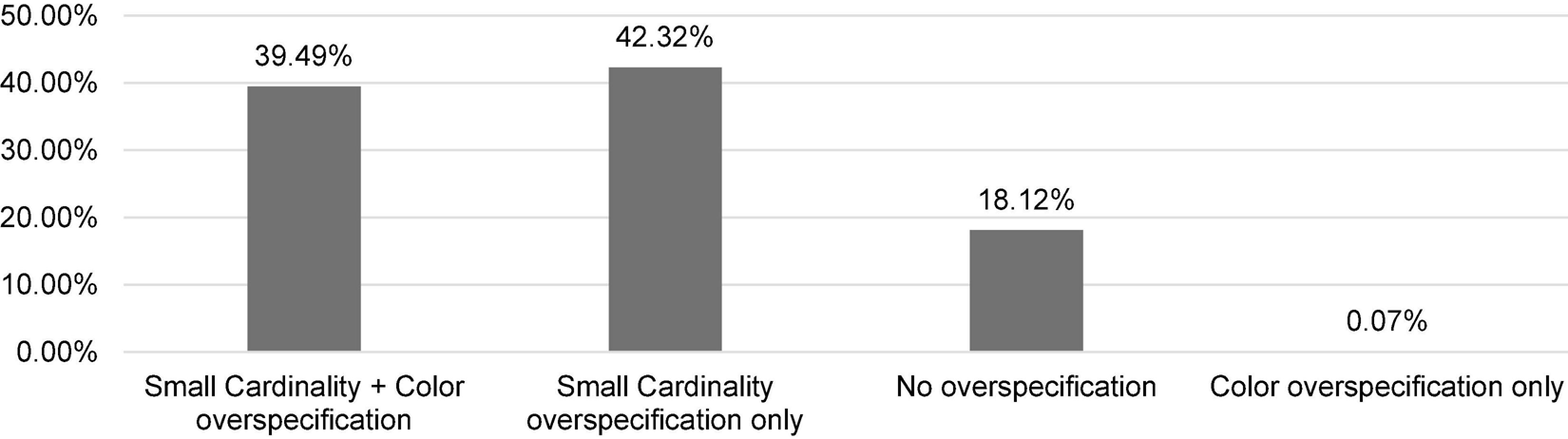 Distribution of small cardinality and color (over-)specification in the second experiment.