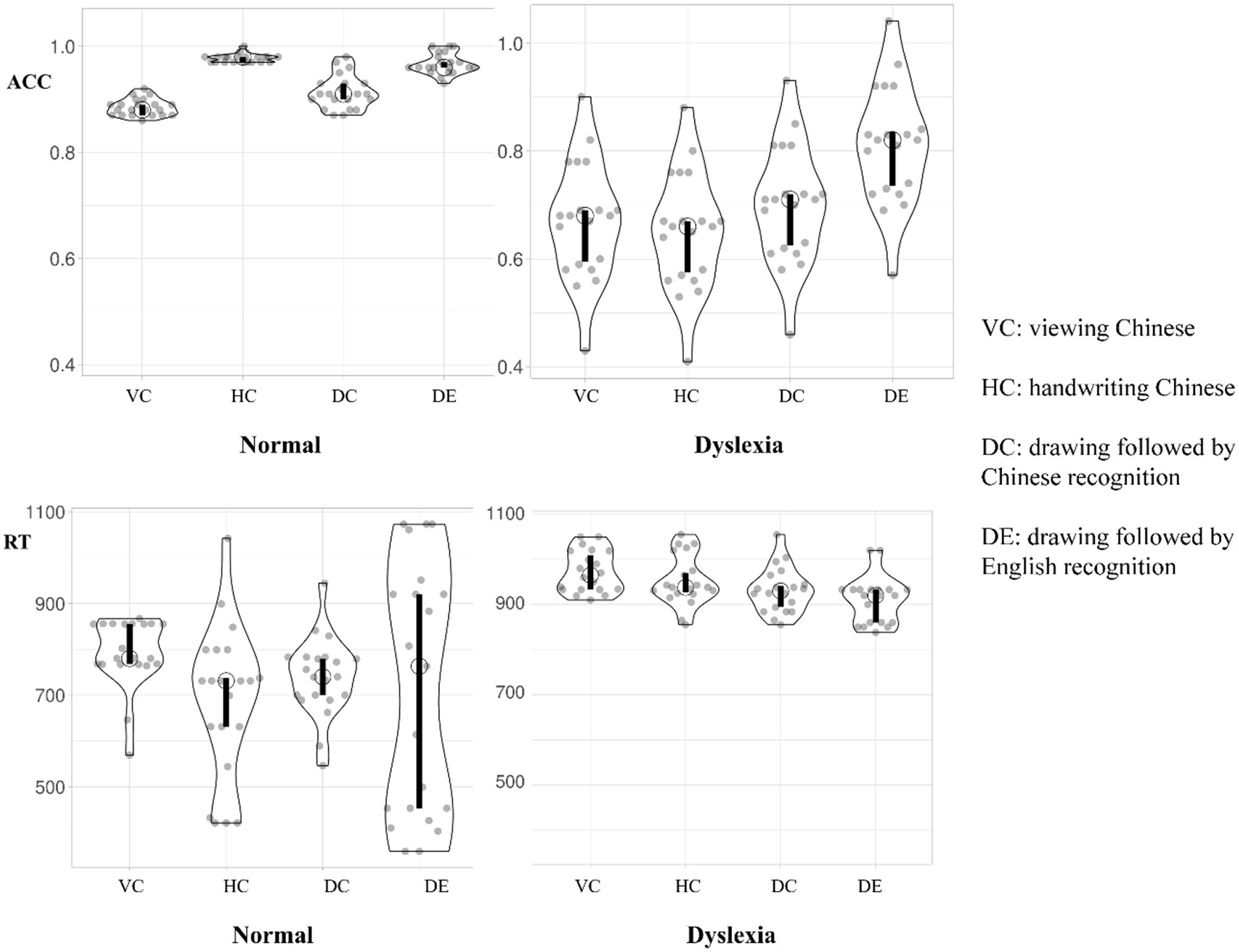 For behavioral data analyses, we collected both accuracy (ACC) and response time (RT) for target 2. Accuracy analyses were based on the aggregated means per subject per condition. We recorded the response time (RTs) at the onset of target 2 button press. The analyses also excluded the outliers in RTs in the extreme 5% on either end of the Z-normalized distribution of RTs (i.e., above and below 1.65 SD of each mean RT per participant). At last, 7.5% of trials being excluded as outliers, following the criteria (from 5 to 10%) suggested by Ratcliff (1993). The descriptive statistics of mean and standard deviation of both ACC and RT for each of four conditions per groups are shown in Table 1. The violin plots summarizing the behavioral data for both normal readers and dyslexic readers are present in Figure 2.