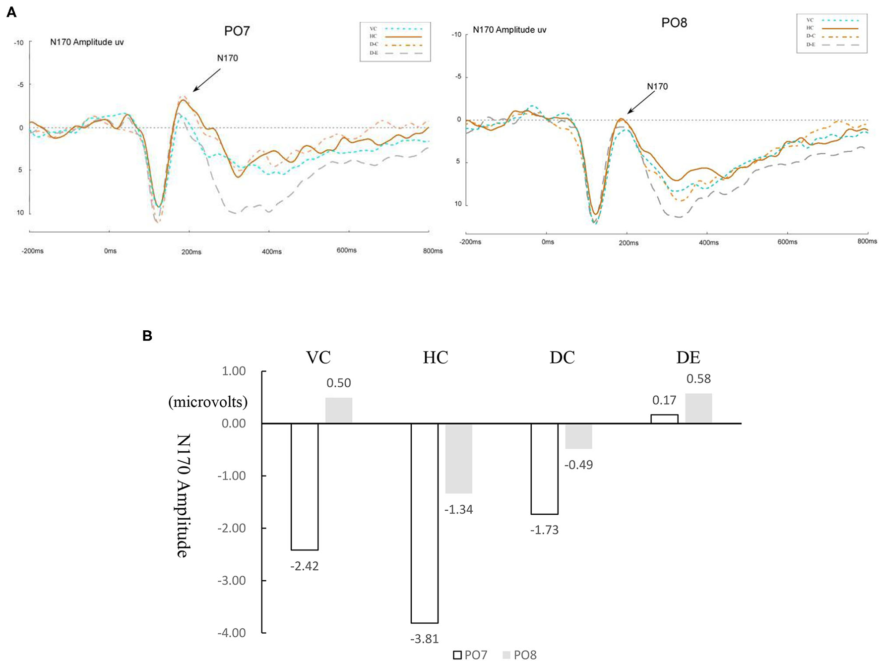 (A) ERP waveforms of N170 under four conditions for dyslexic readers for the left (PO7) and right (PO8) parietal leads. VC, viewing-Chinese; HC, handwriting-Chinese; DC, drawing followed by Chinese recognition; DE, drawing followed by English recognition. (B) Differences between four conditions for dyslexic readers in the amplitude of N170.