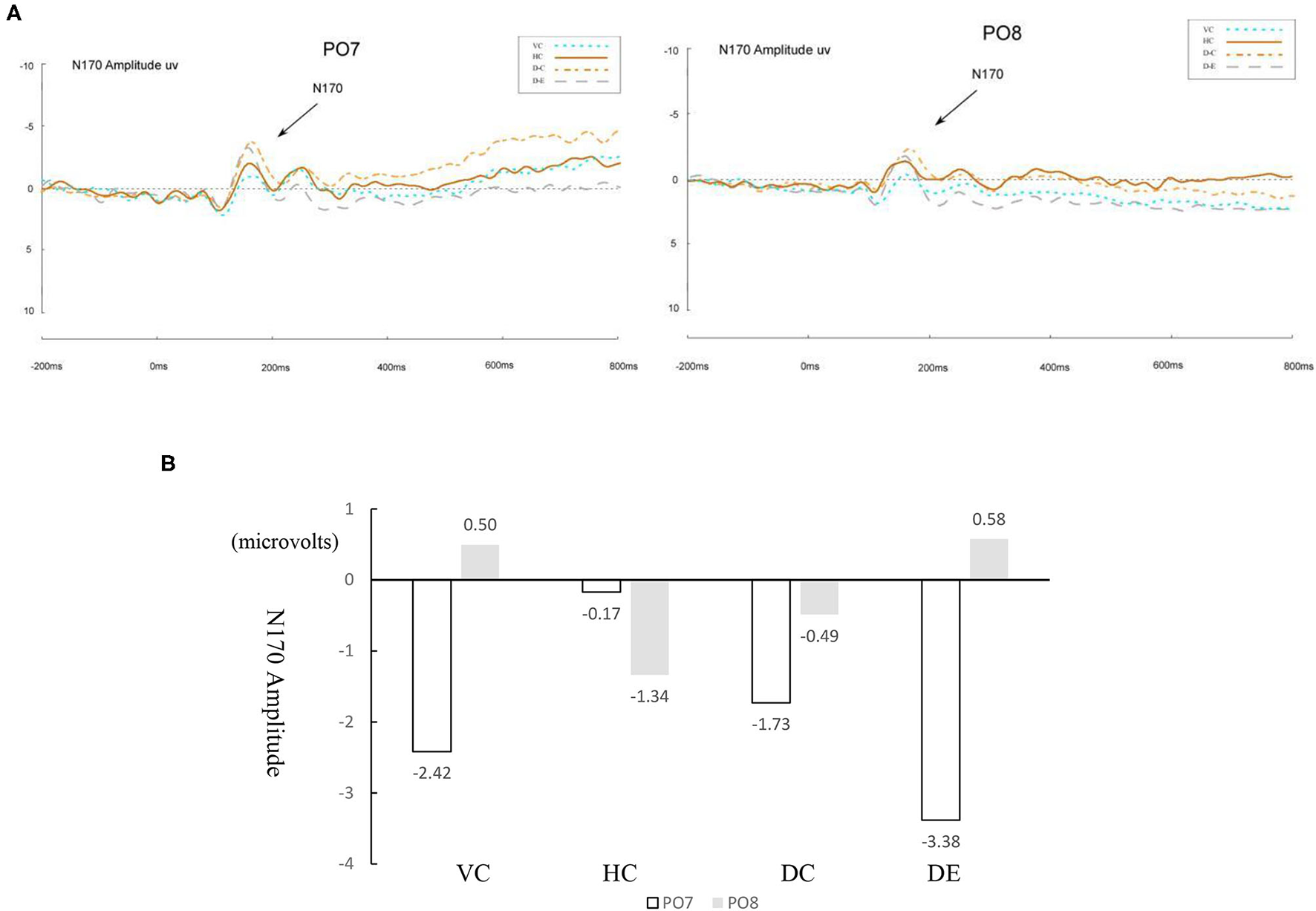 (A) ERP waveforms of the N170 under four conditions for normal readers for the left (PO7) and right (PO8) parietal leads. VC, viewing-Chinese; HC, handwriting-Chinese; DC, drawing followed by Chinese recognition; DE, drawing followed by English recognition. (B) Differences between four conditions for normal readers in the amplitude of N170.