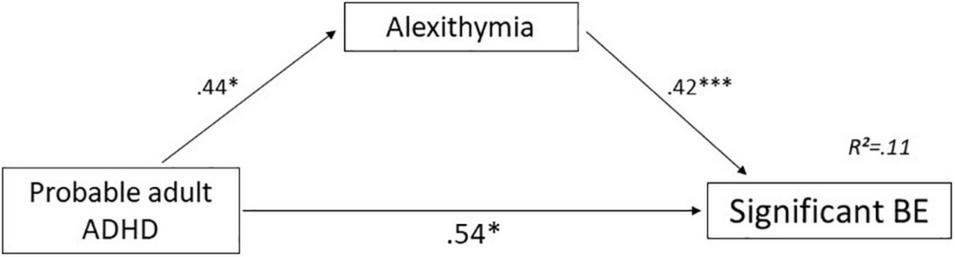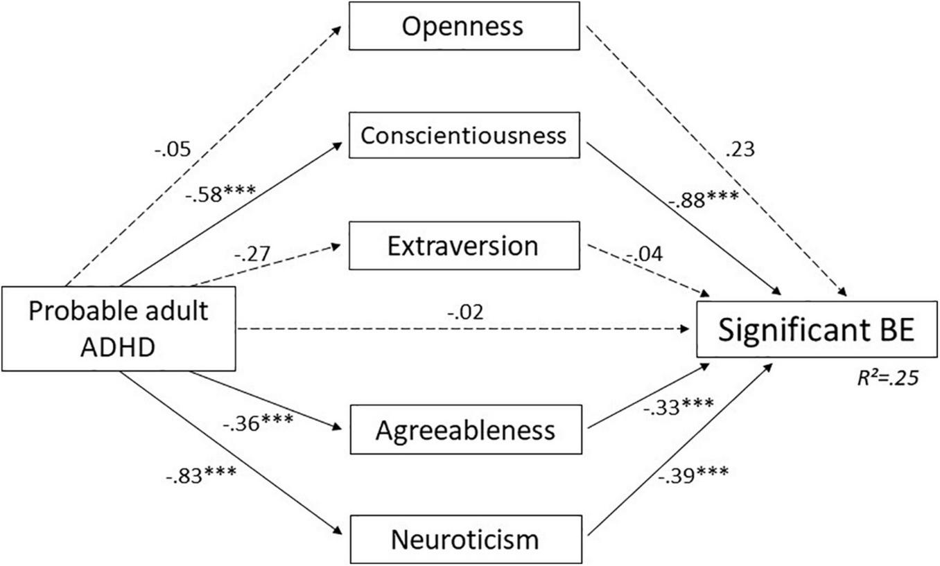 Results: Prevalence of probable adult ADHD, significant BE and FA were 8.2, 19.1, and 26.6%, respectively. Participants who screened positive for addictive-like eating showed higher prevalence of probable adult ADHD, as well as higher scores on adult and childhood ADHD symptoms. They also reported lower conscientiousness, but higher emotion dysregulation, higher alexithymia, and higher neuroticism. Only BE (as opposed to FA) was also associated with lower scores on agreeableness and openness. Analysis of the association between adult ADHD and BE suggests that emotion dysregulation, conscientiousness, agreeableness, and neuroticism are total mediators and alexithymia a partial mediator.