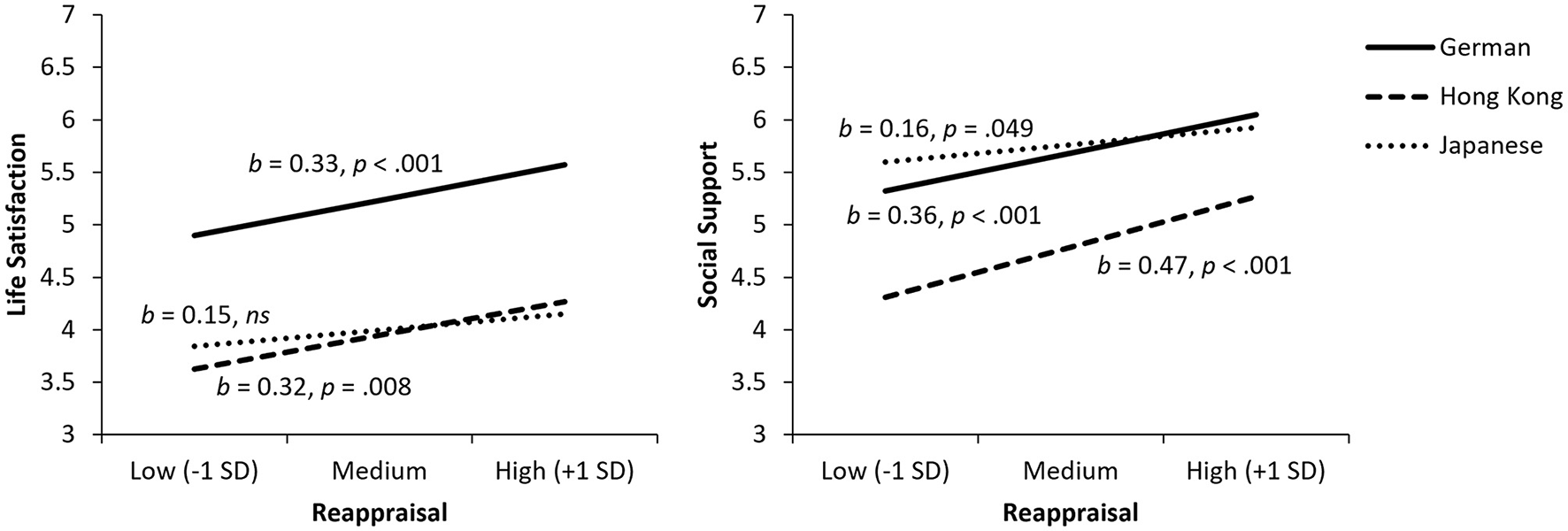 In the present study, we examined associations between ER, life satisfaction, and perceived social support among university students from Germany, Hong Kong, and Japan. Our findings extend previous research by testing social support as a mediator for relationships between distinct ER strategies and life satisfaction across cultural groups. As predicted, suppression was related to lower life satisfaction through less social support among Germans, but not among Hong Kong Chinese (HKC) or Japanese (hypothesis 1). Furthermore, among Germans and HKC, reappraisal was positively related to life satisfaction through more social support, whereas rumination was related to lower life satisfaction through less social support. For Japanese, reappraisal was associated with more social support, but unrelated to life satisfaction. Similarly, for Japanese, rumination was associated with lower life satisfaction, but unrelated to social support. Thus, hypotheses 2 and 3 were only partially supported.