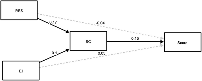 Figure 1 displays the proposed mediation model that the study sought to analyze. Within this figure, the squares represent the values of the scaled variables obtained from each of the scales. The one-way arrows indicates regression relationships. Table 2 shows the results of the analysis for both direct and indirect regression relationships in the mediational model. Figure 2 shows the summarized results of the proposed model. The continuous black arrows show the significant relationships, while the dashed gray arrows show the non-significant relationships of the model. As can be observed, all significant relationships in the model involve self-concept. Thus, the only factor that is significantly directly related to the mark is self-concept (β = 0.15, p < 0.001). That is, those students with a higher self-concept will show better academic performance. Additionally, self-concept indirectly mediates the relationship between resilience and Mark (β = 0.02, p = 0.004), and the indirect mediating relationship between emotional intelligence and mark is very close to significance (β = 0.01 p = 0.056). The remaining significant relationships were between self-concept and resilience (β = 0.17, p > 0.001) and between self-concept and emotional intelligence (β = 0.10, p = 0.035).