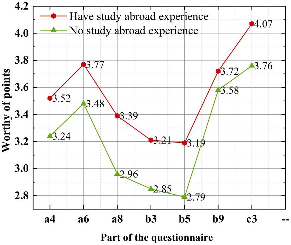 Figure 5 shows the average score of the subjects with and without studying abroad experience. Specifically, the average score of the students with studying abroad experience is higher than that of the students without studying abroad experience on some questions in the questionnaire, which is also intuitively reflected in the figure.