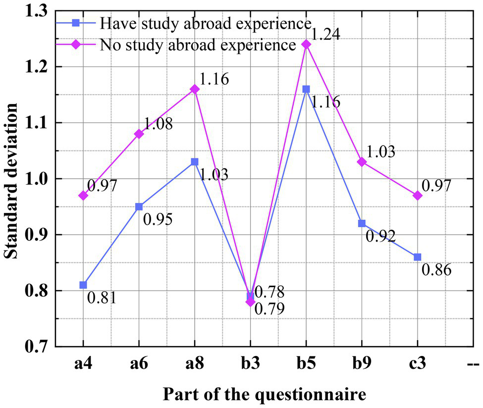 Figure 6 shows that a more in-depth analysis of the results of the questionnaire is conducted, and the standard deviation of each question is calculated. From the curve of standard deviation, it is found that the standard deviation of the subjects with study abroad experience is smaller than those without study experience. This also verifies that the students with study abroad experience have higher scores in each dimension of the questionnaire, and they receive better entrepreneurship education, have better psychological resilience and swindler syndrome than domestic college students (Cisco, 2020).