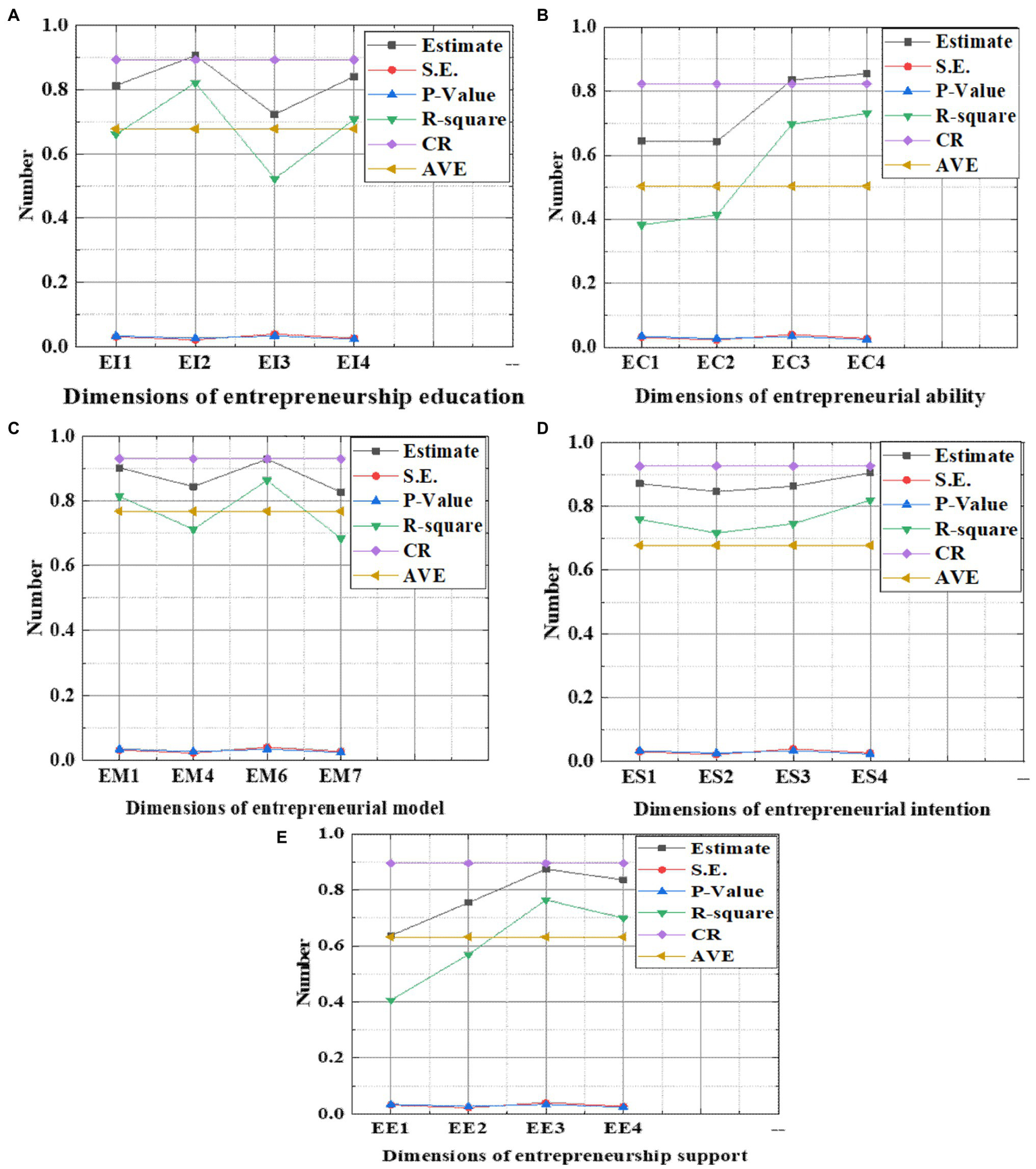 Reliability of each dimension (CR: constituent reliability; AVE: convergent validity; and S.E.: regression standard deviation). (A: entrepreneurship education; B: entrepreneurial ability; C: entrepreneurial model; D: entrepreneurial intention; and E: entrepreneurial support).