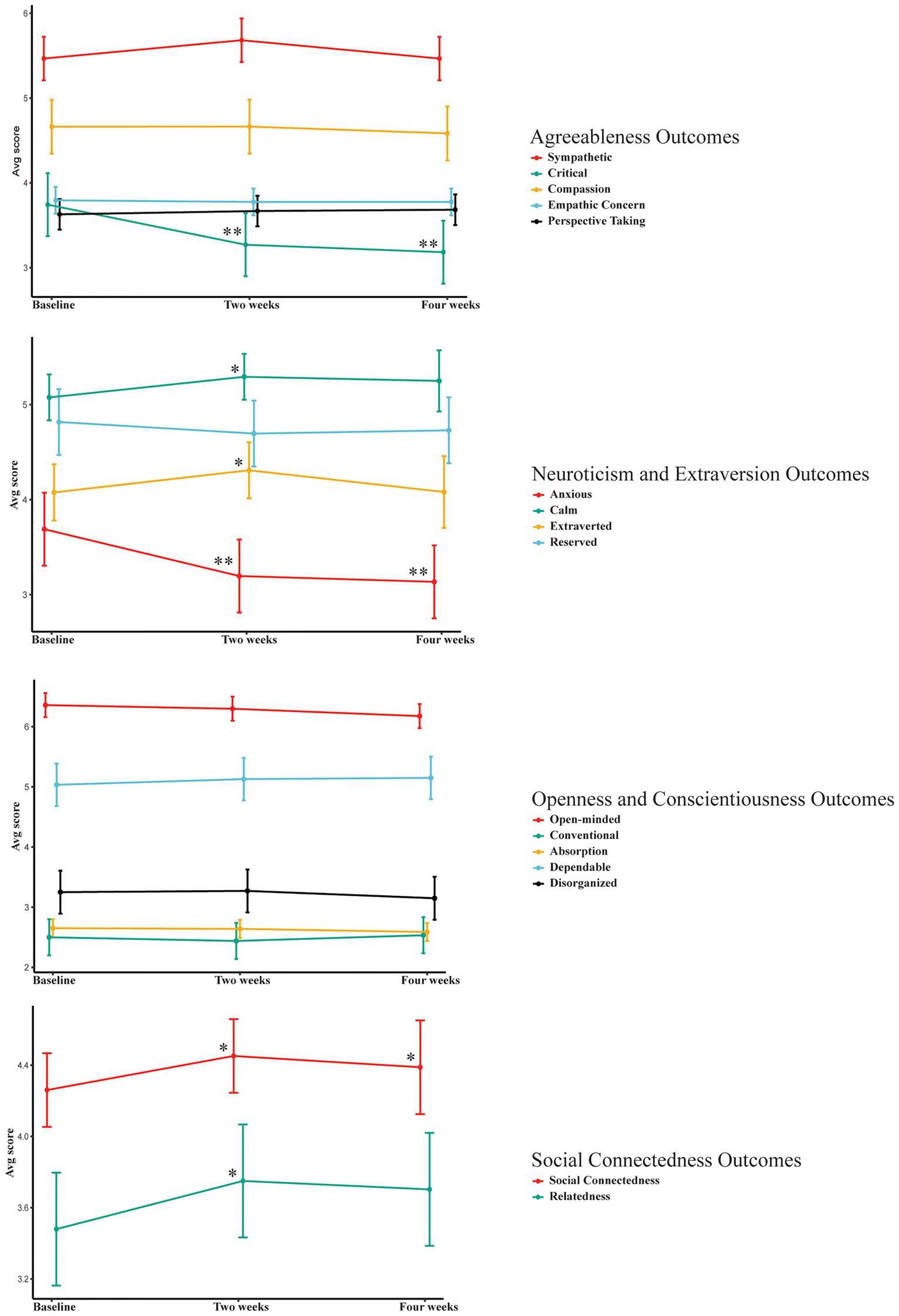 The TIPI (Gosling et al., 2003) consists of 10 items, with two items for each FFM domain: “Anxious, easily upset” and “calm, emotionally stable” index Neuroticism; “extraverted, enthusiastic,” and “reserved, quiet” index Extraversion; “critical, quarrelsome,” and “sympathetic, warm” index Agreeableness; “open to new experiences, complex” and “conventional, uncreative” index Openness; “dependable, self-disciplined” and “disorganized, careless” index Conscientiousness. Participants rated each item on a 7-point Likert-scale (1=Disagree strongly; 7=Agree strongly). Previous research has demonstrated good test–retest reliability and convergent validity for TIPI domains (Ehrhart et al., 2009). More broadly, FFM traits have shown adequate test–retest reliability across an average interval of 4weeks (rs>0.77; Gnambs, 2014), and longitudinal measurement invariance has been supported at the metric and scalar level in large samples (Lucas and Donnellan, 2011; Wortman et al., 2012). Unfortunately, consistent with past research (Gosling et al., 2003), internal consistency for three of five TIPI domains was low ([TIPI OpennessT1: α=0.40]; AgreeablenessT1: α=0.37; ConscientiousnessT1: α=0.48). Because heterogeneity in constructs can substantively obscure clear longitudinal changes and limit interpretation, we assessed TIPI items individually.