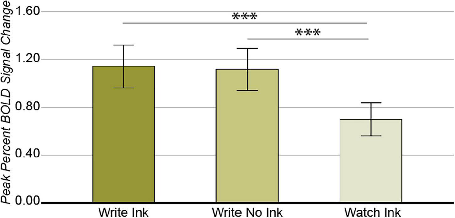 Activation during handwriting in the adult group was consistent with prior literature that has demonstrated a gradient of functional selectivity where dorsal/anterior brain regions are related to motor processing while ventral/posterior brain regions are related to visual processing (James and Gauthier, 2006; Planton et al., 2013, 2017; Vinci-Booher et al., 2019). In the current study, frontal and anterior parietal ROI responses were greatest during motor actions (Write Ink and Write No Ink) while ventral-temporal ROI responses were greatest in the visual-only condition (Watch Ink) in both child and adult participants.
