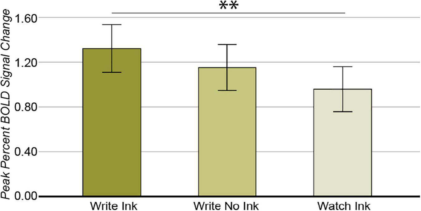 Again, we observed a significant main effect of condition in this region [F(2,74) = 5.052, p = 0.009, post hoc power 0.803; Figure 4], with greater response during the Watch Ink (M = 0.876, SD = 0.700) condition than Write No Ink (M = 0.426, SD = 0.641) condition [t(40) = 3.246, p = 0.002]. There was no difference between the Watch Ink and Write Ink (M = 0.677, SD = 0.641) conditions [t(39) = 1.548, p = 0.130] or the Write Ink and Write No Ink conditions [t(39) = 0.1.671, p = 0.103]. The main effect of age group was not significant [F(2,37) = 0.715, p = 0.496, post hoc power 0.162], nor was the two-way interaction [F(4,74) = 2.050, p = 0.096, post hoc power 0.586].