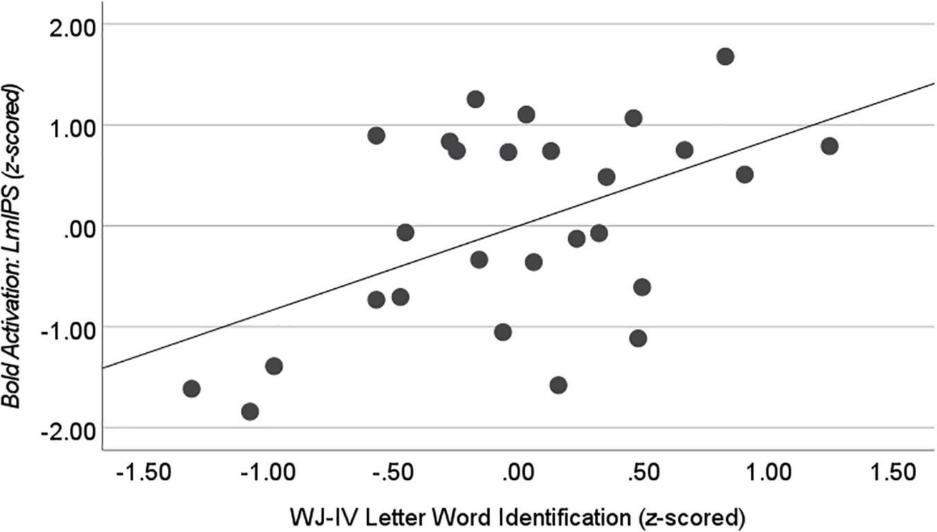 Figure 9. Correlation with WJ-IV Letter Word Identification during Write Ink. Activation in the left middle intraparietal sulcus (LmIPS) correlated with performance on the WJ-IV Letter Word Identification in the child participants after controlling for age (r = 0.515, n = 27, p = 0.007).