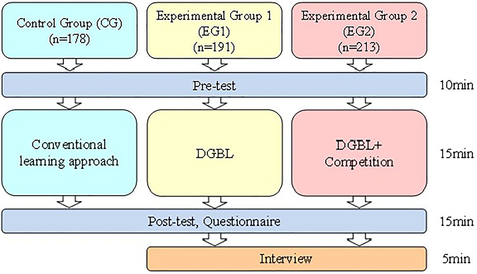 Data were collected among junior high school students in Taichung, Taiwan. There were approximately 600 students. All the participants learned the basic concept of binary conversion. The experimental procedure was conducted for 50 min (Figure 3). External validity refers to the appropriateness of the dynamic relationship between the various variables in the research if it is taken by different populations, experimental conditions, or specific experimental period. To improve the external validity of the research, we took larger populations and random sampling. Therefore, this research collected approximately 600 students and also adopted random sampling for three different groups. The students learned via either application or conventional lectures in three groups. The control group (CG) learned the course through a conventional learning approach, which means the instructor would only use a textbook or PowerPoint to teach the course. Experimental Group 1 (EG1) could only learn by a digital game, while Experimental Group 2 (EG2) learned through a digital game, with the added structure of competing with classmates.