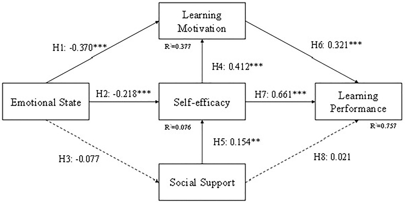 We used structural equation modeling (SEM) to test our research model (Figure 2). To ensure the study had good reliability and validity, preliminary tests, which involved checking the unidimensionality of the five parts of the construct (Emotional state, Social support, Self-efficacy, Learning motivation, Learning performance), were taken.