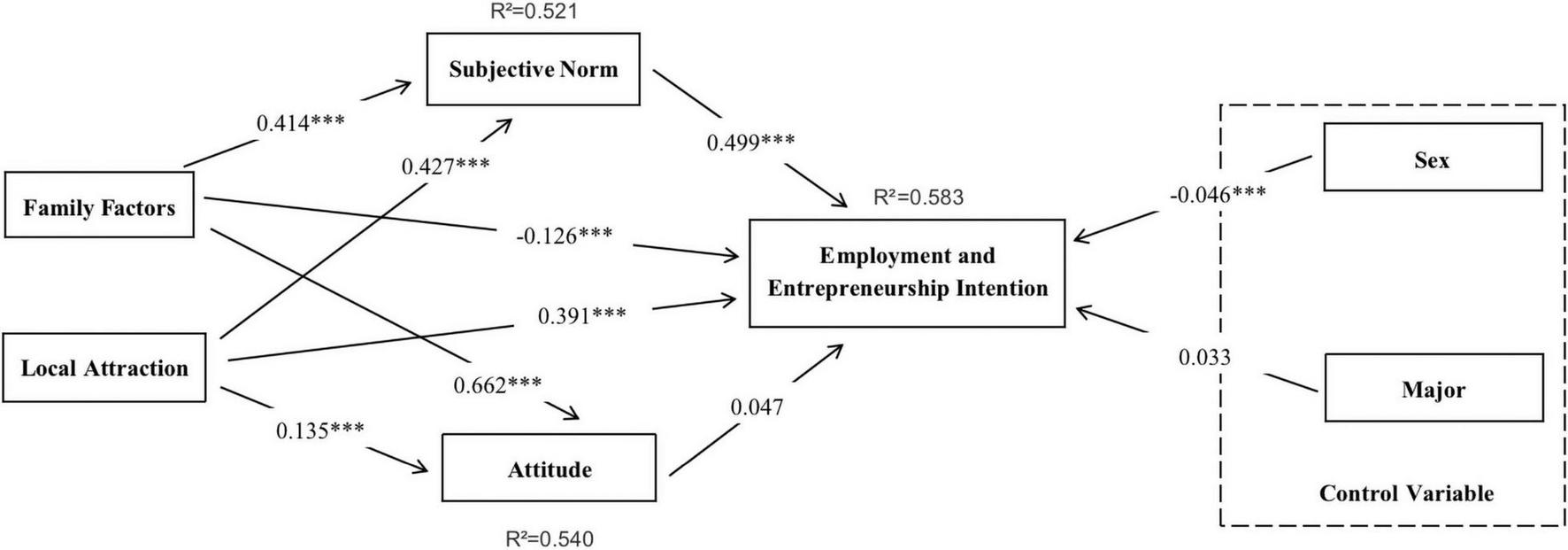 Exploring the occupational and entrepreneurial intentions of college graduates is particularly crucial in the context of harsh employment environments and the uneven regional distribution of talent. In 2020, the number of university graduates in China reached 8.74 million, a 0.4 million increase compared with the previous year. As a consequence of the economic recession and COVID-19 pandemic, graduate employment became increasingly difficult to secure. Every industry was affected to some degree, and the gap between supply and demand about college Students’ entrepreneurship and the employment market grew more pronounced. China’s job market prosperity index was substantially reduced, and new university graduates’ pursuit of entrepreneurship and employment appeared unpromising. Therefore, graduates’ entrepreneurship and employment become a major concern for all higher education stakeholders, including universities, the government, employers, and graduates themselves (Xie et al., 2017). In the future, regional enterprises in counties may face challenges in locating local and talented individuals to employ. Enabling university graduates to find employment within the local economy is the key step to revitalizing universities and the county as a whole. This would encourage university graduates to remain in the county and assist in the fundamental development and promotion of the local economy as well as the balance of county–city talent resource allocation. To attract talent to various counties and thereby promote industry growth and restructuring, the willingness of university students to remain in the county for entrepreneurship or employment purposes and relevant influential factors must first be assessed. Improvement measures can then be proposed, with the data serving as a valuable reference for future county employment development schemes. A review of the literature indicates that environmental factors are changing how career decisions are made (Callanan et al., 2017). Factors such as family education and parents’ educational background also affect the job location decisions of graduates (Rérat, 2014).