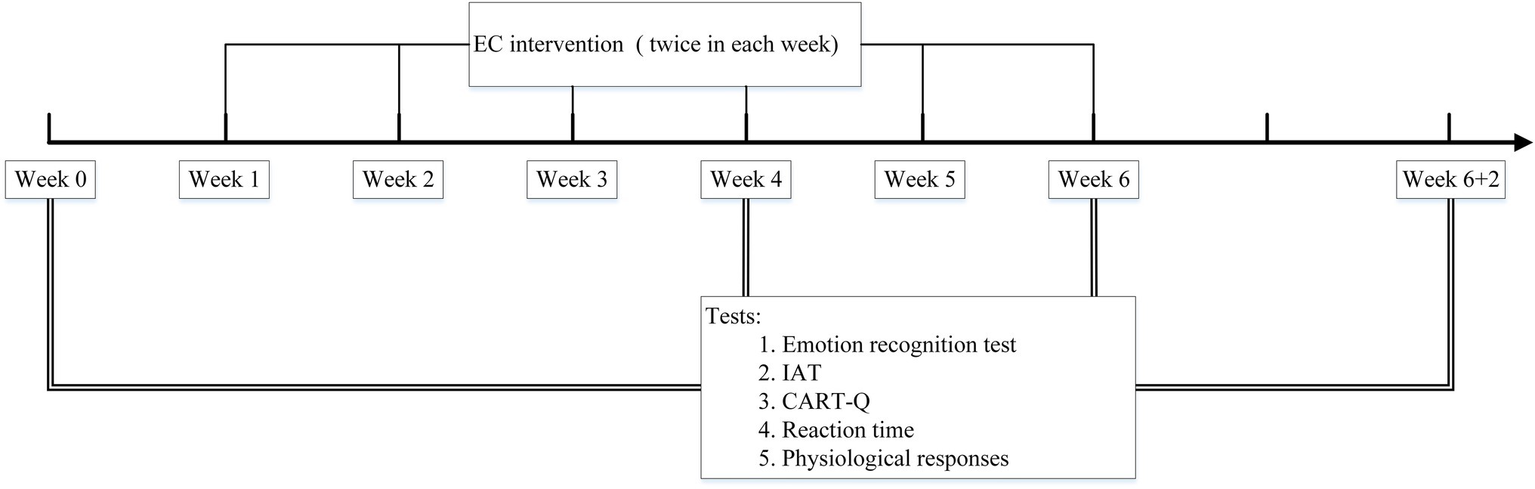 Figure 1. The timeline of the EC intervention and the tests. The EC intervention was conducted twice a week for 6weeks (Week 1–6). The measures were tested before the intervention (Week 0), during the intervention (Week 4), at the end of the intervention (Week 6), and post intervention (Week 6+2).