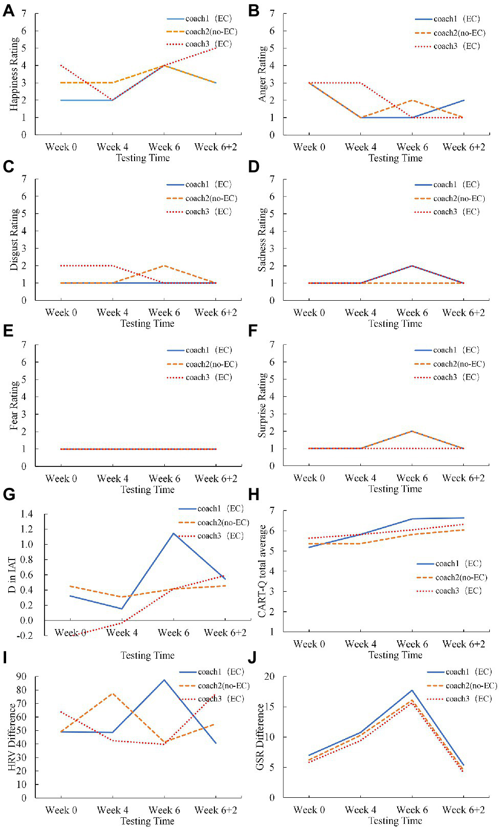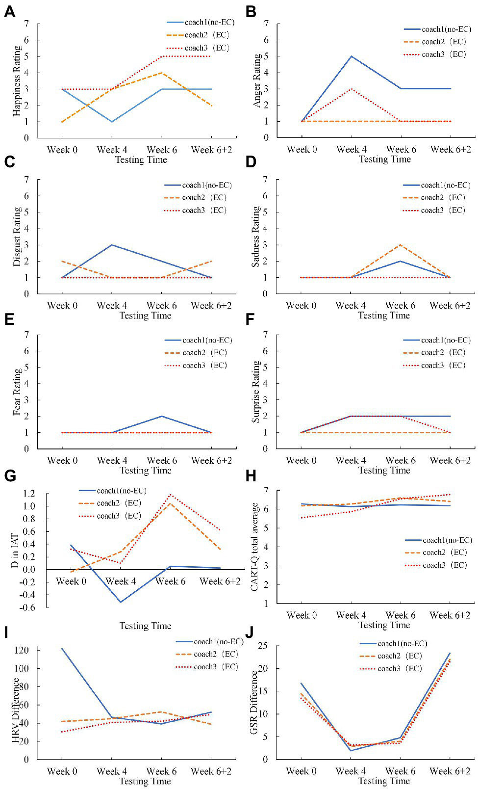 Figure 2. The variation of Athlete 1’s (A–F) the emotion ratings (happiness, anger, disgust, sadness, fear, surprise), (G) the D score in IAT, (H) the CART-Q scores, (I) the HRV, and (J) the GSR with time for the coaches with and without EC.