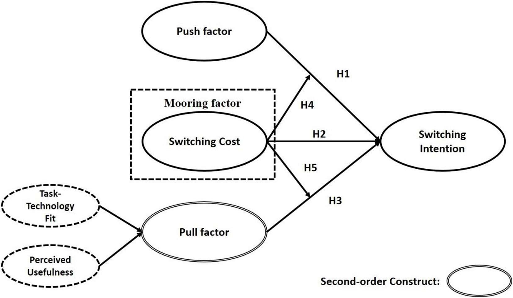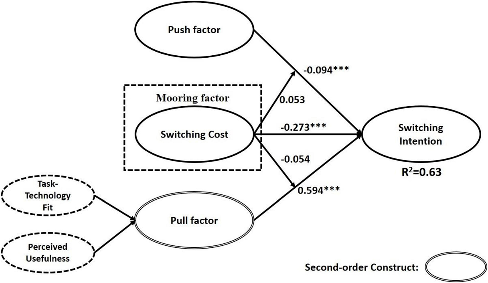 First, the measurement model analysis included the Cronbach’s alpha validity, convergence validity, and discriminant validity, which verified the reliability and validity of the scale measurement. Second, the PLS was used to evaluate the model. The PLS-SEM was chosen for analysis, as it was more suitable than SEM based on covariance and was mainly adopted to conduct an exploratory study of theoretical development and the potential variable scores were required for subsequent analysis in this study (Balakrishnan et al., 2017). In addition, a second-order model with a reflective form was adopted. The pull factor is a second-order forming entity in this study with pull factors including a reflective construct dimension-perceived usefulness and TTF. However, because SEM based on covariance cannot test the second-order formative construct, the PLS-SEM is the best option for testing the second-order formative construct (Balakrishnan et al., 2017). As a result, the PLS approach was appropriate for model analysis in this study.