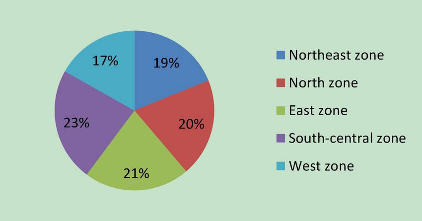 In the name of the Torch High-Tech Industrial Development Center, we distributed 200 surveys through e-mail, WeChat, and an online chat APP (QQ). The survey states that this study aimed at assistance of policymaking explicitly and it was endorsed by the Strategy Research Institute of the Wuhan East Lake High-Tech Development Zone, so we collected 142 complete responses, 37 incomplete responses, and 21 surveys have no responses at last. We also distributed surveys face-to-face by means of annual meeting and special conference and collected 54 responses. Thus, the total valid samples are 196. Figure 3 shows the regional distribution of 196 samples. The samples from South-Central zone and East zone are slightly more. In general, the samples are evenly distributed in five zones and have no regional bias.