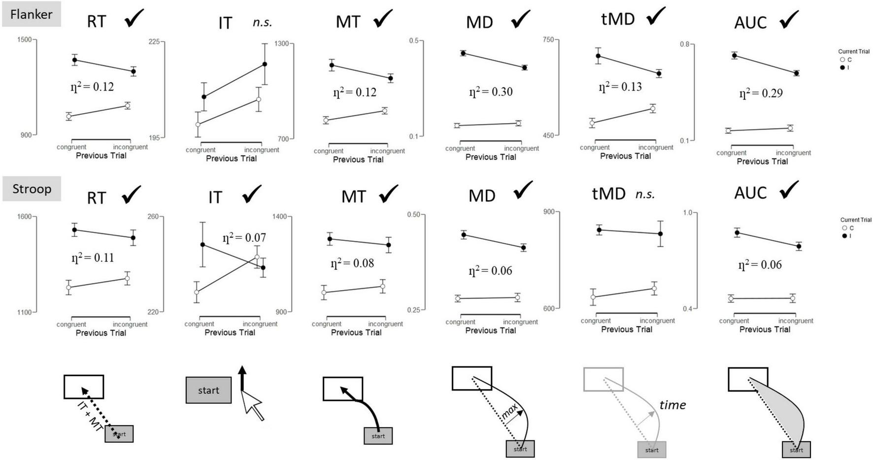 Sequential congruency effects (interaction between Current Trial and Previous Trial) by task and dependent variable. RT, Reaction Time; IT, Initiation Time; MT, Movement Time; MD, Maximum Deviation; tMD, Time to Maximum Deviation; AUC, Area Under the Curve. Checkmarks indicate significant effects (p < 0.05). n.s., non-significant.