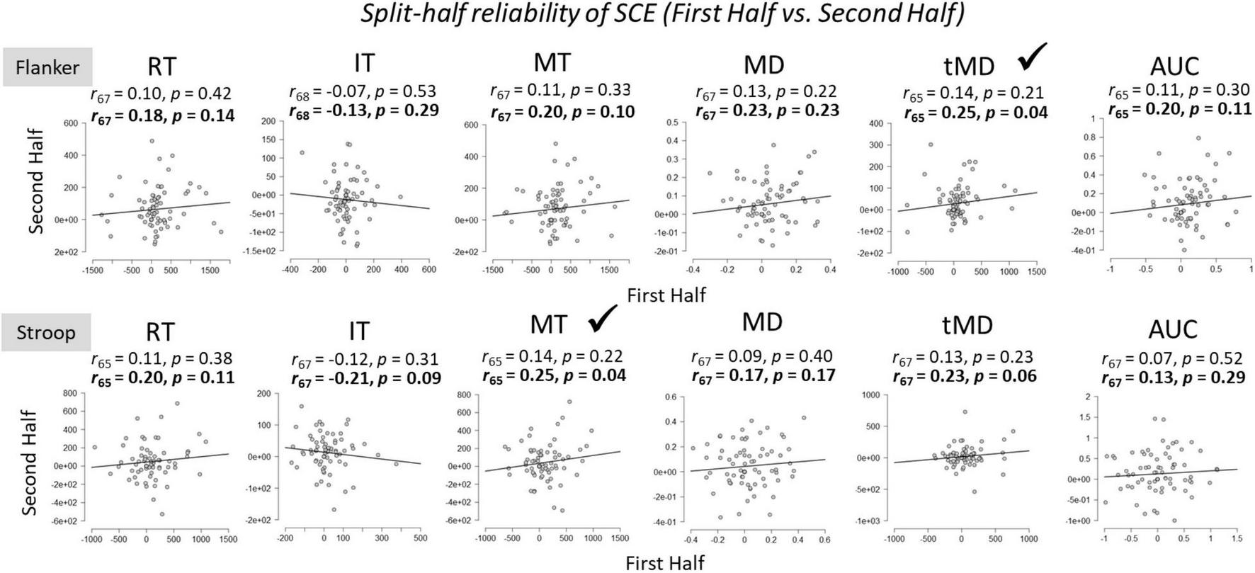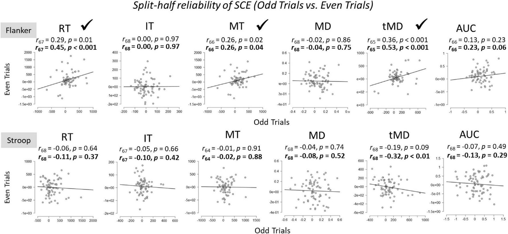Within-task split-half (odd vs. even trials) reliabilities of the SCE for Flanker and Stroop tasks. RT, Reaction Time; IT, Initiation Time; MT, Movement Time; MD, Maximum Deviation; tMD, Time to Maximum Deviation; AUC, Area Under the Curve. Checkmarks indicate significant correlations (p < 0.05). Significant reliability (i.e., positive Pearson r correlation coefficients) after Spearman-Brown prophecy correction are marked with a check mark. Un-bolded values above the graphs represent Pearson r correlation coefficients without correction, and bolded values represent Pearson r correlation coefficients after Spearman-Brown correction.