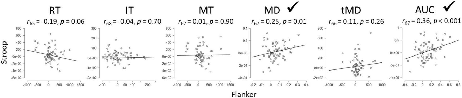 Between-task reliabilities of the SCE for Flanker and Stroop tasks. RT, Reaction Time; IT, Initiation Time; MT, Movement Time; MD, Maximum Deviation; tMD, Time to Maximum Deviation; AUC, Area Under the Curve. Checkmarks indicate significant correlations (p < 0.05).