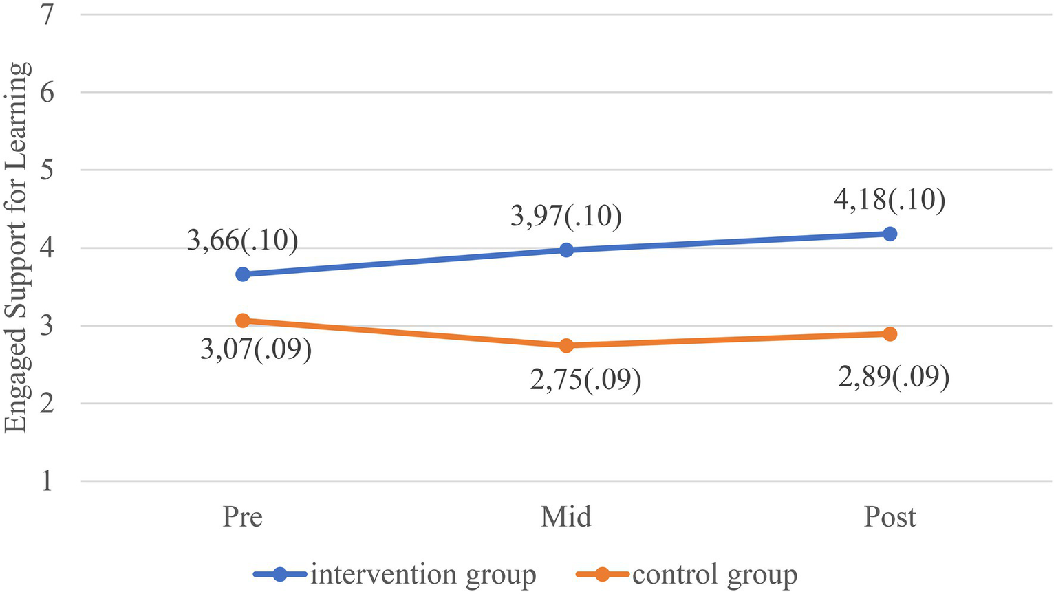 Table 2 shows the results of the linear mixed models. The quality of the teacher-toddler interactions in the intervention group increased significantly more in both CLASS domains and all the quality dimensions from baseline to post-intervention compared to the control group, except for Negative Climate. The differences in change between the control group and intervention group from baseline to mid- and post-intervention for EBS and ESL can be seen in Figures 2, 3 (graphical displays of the changes on the dimension level can be found in Supplementary Material). Effect sizes for the EBS domain were Cohen’s d=0.3 mid intervention and 0.4 post-intervention. For the ESL domain, effect sizes were Cohen’s d=0.7 mid-intervention and 0.8 post-intervention. According to Cohen (1988), an effect size of 0.2 is considered small, an effects size of 0.5 is considered medium, and an effect size of 0.8 is considered large. For the dimensions Behavior guidance, Facilitation of learning and development, Quality of feedback, and Language modeling, the difference in quality change between the intervention and control group was evident already at mid intervention. Inspection of the means on each quality dimension at the three measurement timepoints, as well as inspection of the graphical displays, revealed that whereas the quality in the intervention groups increased during the course of the year, the quality in the control group decreased from baseline to post-intervention.