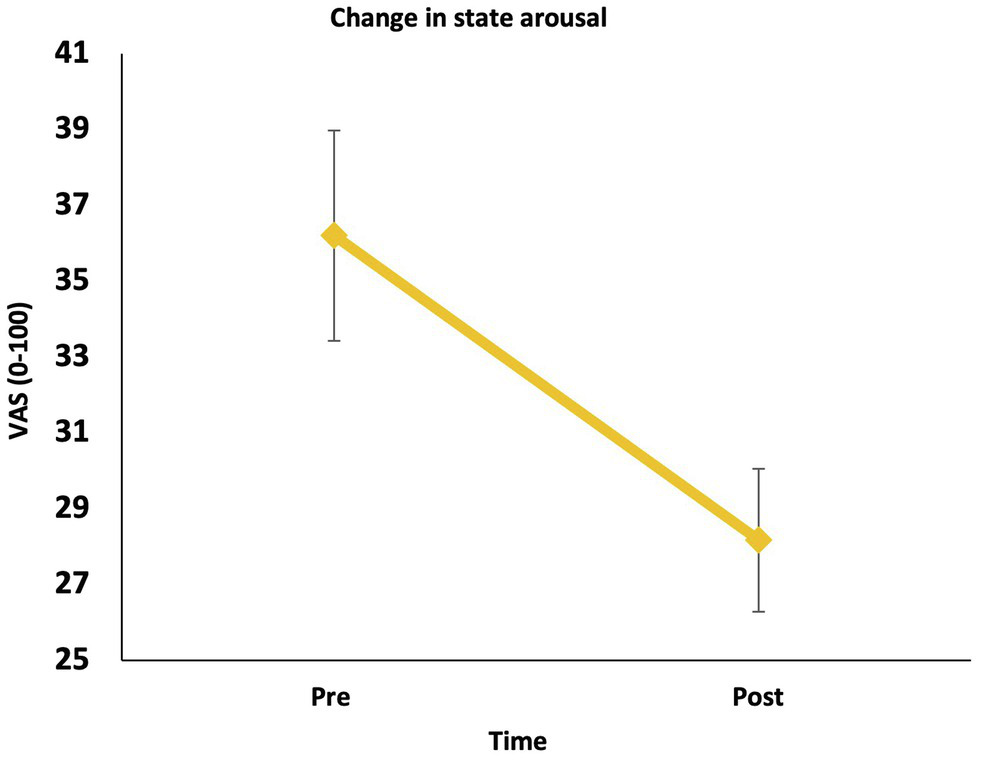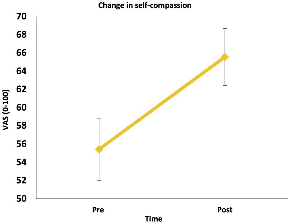 Visual Analogue scales (ranging from 0 to 100) were used to establish state levels of self-compassion, hyperarousal and social connectedness before and after the LKM-S. State self-compassion was used as a manipulation check to determine self-compassion induction in participants and also engagement with the meditation. The VAS measure is adapted from Kirschner et al. (2019) and questions are taken from the Self-Compassion Scale (SCS; Neff, 2003a), social connectedness questions are based on the state adult attachment measure (SAAM; Gillath et al., 2009) and four adapted items from the PCL-5 have been added to measure state hyperarousal. The VAS has been used in previous studies (Kirschner et al., 2019, 2021) which found Cronbach’s α = 0.66 for state affiliative affect, state self-compassion (Cronbach’s α = 0.73 in this sample) and state self-criticism (Cronbach’s alpha in this sample was 0.73 for the inadequate self, 0.76 for the hated self, and 0.77 for reassure self).
