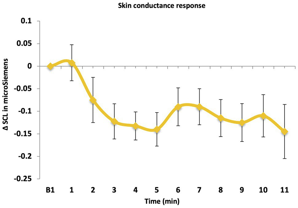 The study used a repeated measures design to test Hypotheses 1, 2a, and 3a, using outcome score at Time 1 (pre-LKM-S) and Time 2 (post-LKM-S) as dependent variables for self-report state hyperarousal, social connectedness and self-compassion. For SCL, HR, and HRV (Hypotheses 2b and 3b) the response in relation to the baseline (prior to the LKM-S) per minute over 11 min formed the repeated measures. In addition, a one-sample design was used to determine significant change from the baseline that was set to zero. To investigate the role of individual differences (Hypotheses 4 and 5), a correlational design was applied.